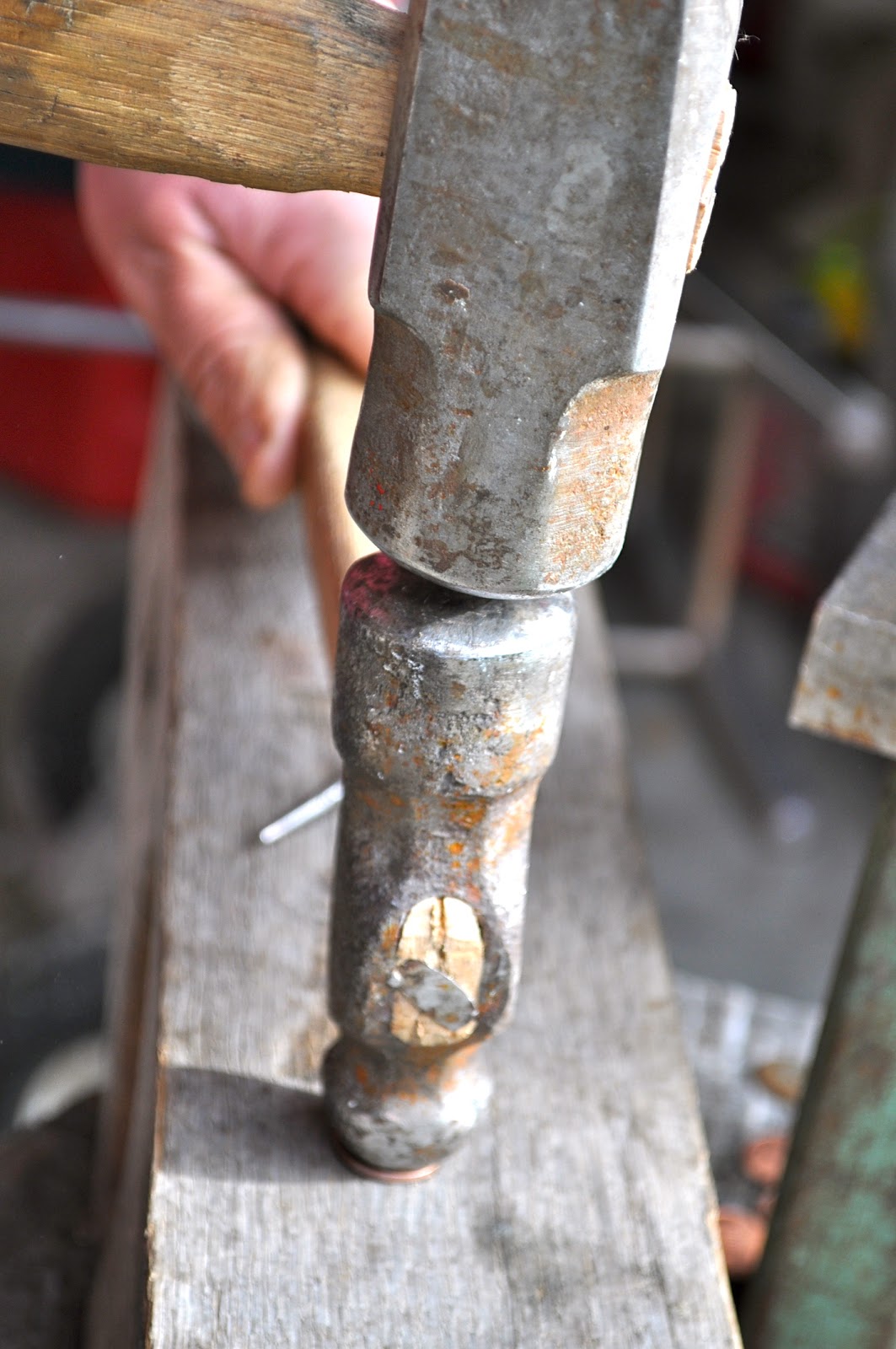Set the button aside and use the ball peen hammer to make a nice dent in your post–one good whack is all you need and it has to be fairly hearty!