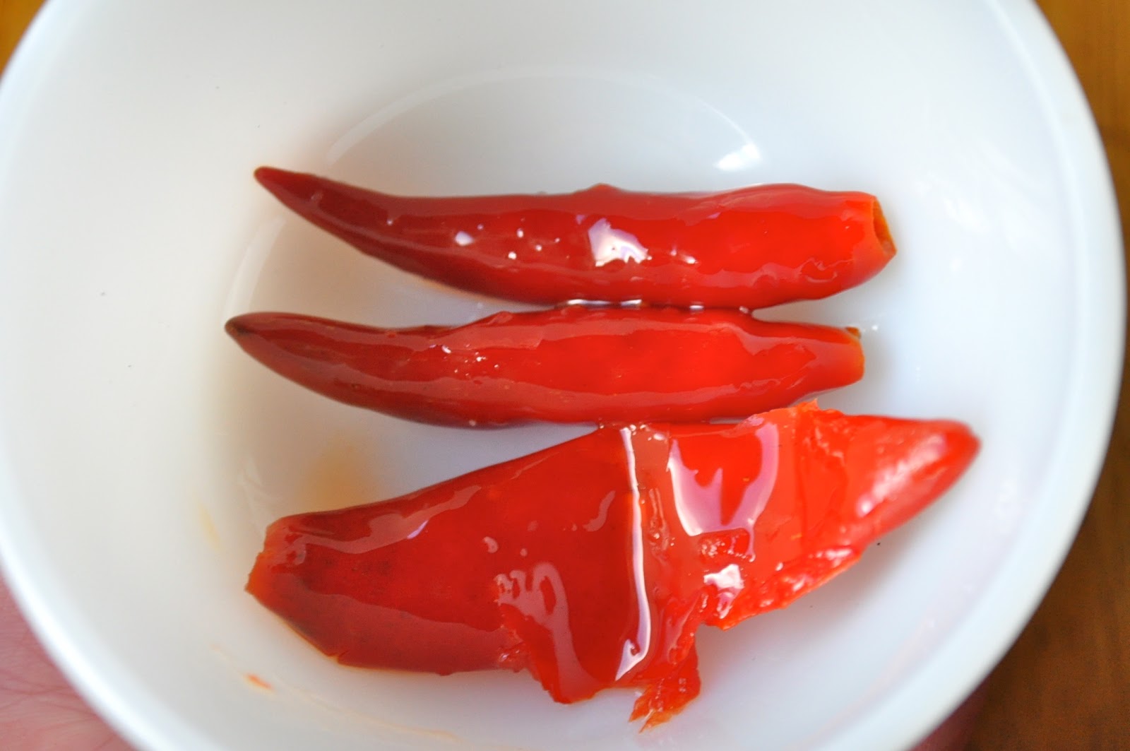 - carefully pick out the hot peppers, save in case you want to add one back for spice