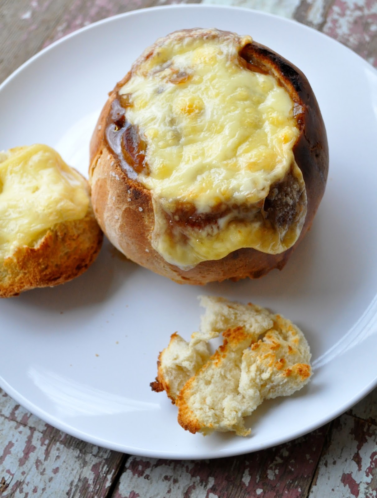 Here they are filled with a version of this French Onion Casserole. I cooked the recipe right up until it’s been simmered for 10 minutes. Then instead of putting in a 9×13, I put it in the bread bowls. Then topped them with swiss cheese and ran under the broiler for about 5 minutes or so.