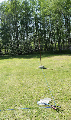 Now a regulation badminton set up is around 41×17 feet with a net about 6 feet off the ground. We felt no need to stick to regulation size and made up our own size to fit our needs(and truth be told our net, which is huge and ridiculous with it’s concrete feet but it works). You’ll probably want to go this route as well because your needs and net will be different than other people. If you have teens and a lot of them you may want a longer or wider space to allow everyone to fit and you if have a bunch of little ones you may need a smaller space and definitely a lower net. I’m giving you the dimensions for the court we made and how to set it up, you can take that and make it yours to suit you.