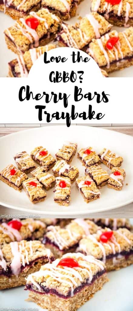 Cherry bars feature a crispy shortbread base with a tangy fresh-made bing cherry topping, crumble on top and a fun layer of cherry icing drizzled over that. SO many fun layers all baked in a 9X13 pan! A true GBBO Traybake, if I ever saw one!