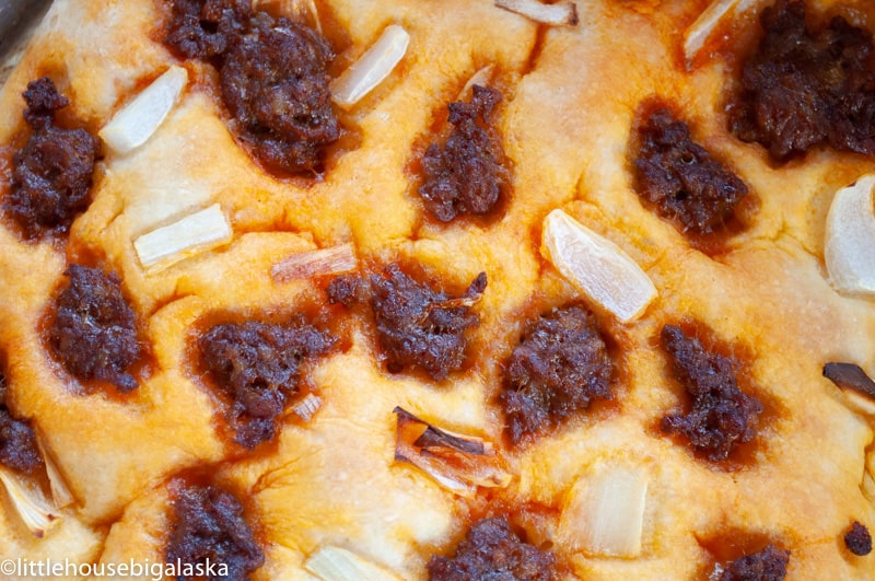 - break up the sausage and crumble it over the top of the dough, dividing it between all four loaves
