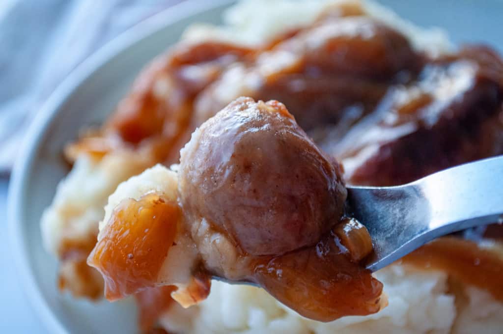 Once I had the sausages I went looking for a recipe for gravy. I wanted to know WHAT kind of gravy to make. My big question was it just brown gravy or was it an onion gravy? Turns out it’s traditionally an onion gravy.
