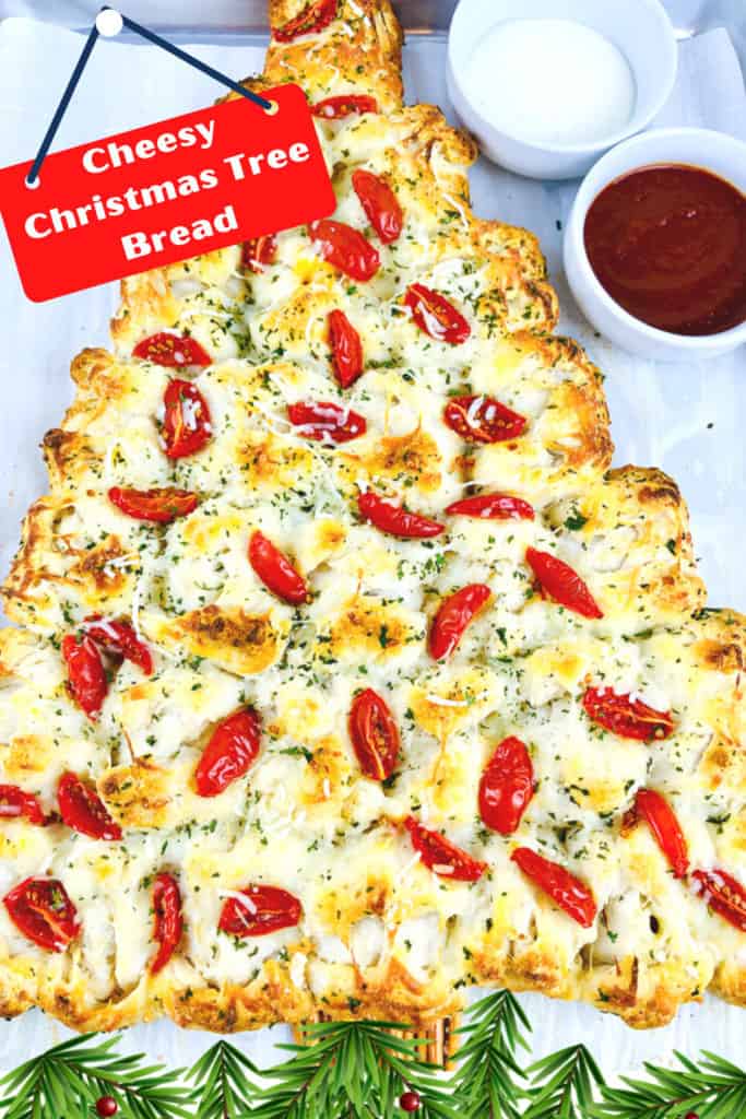 Canned biscuits, three kinds of cheese sticks, fresh tomatoes, grated mozzarella, and just a few fridge and pantry staples come together to make this Cheesy Christmas Tree Bread a REAL.