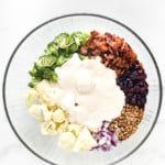Typically broccoli cauliflower salad has a heavy mayo dressing. I’ve taken that dressing and lightened it up a bit by replacing half of it with greek yogurt. The flavor is all there but knowing it’s a little light makes it taste even better!