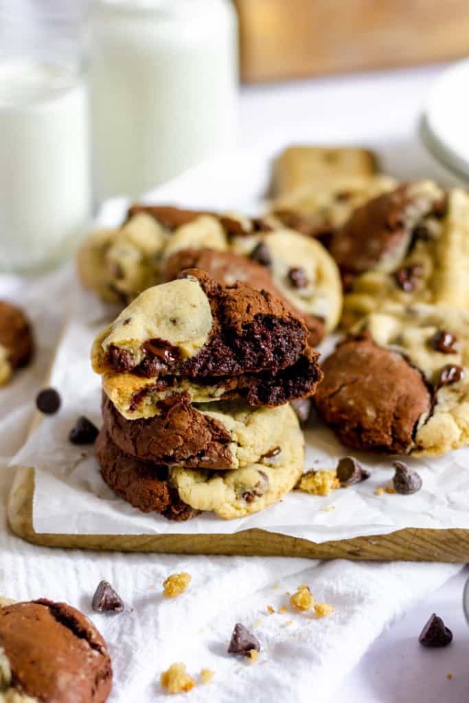 Why not, right? There’s no better reason for baking than why not. Sometimes you don’t know what you want to bake and sometimes you have a difficult crowd to please. No matter what they’ll love these brookies from scratch. If you JUST want one kind of dough and it has to be brownie try these Fudgy Brownie Cookies!