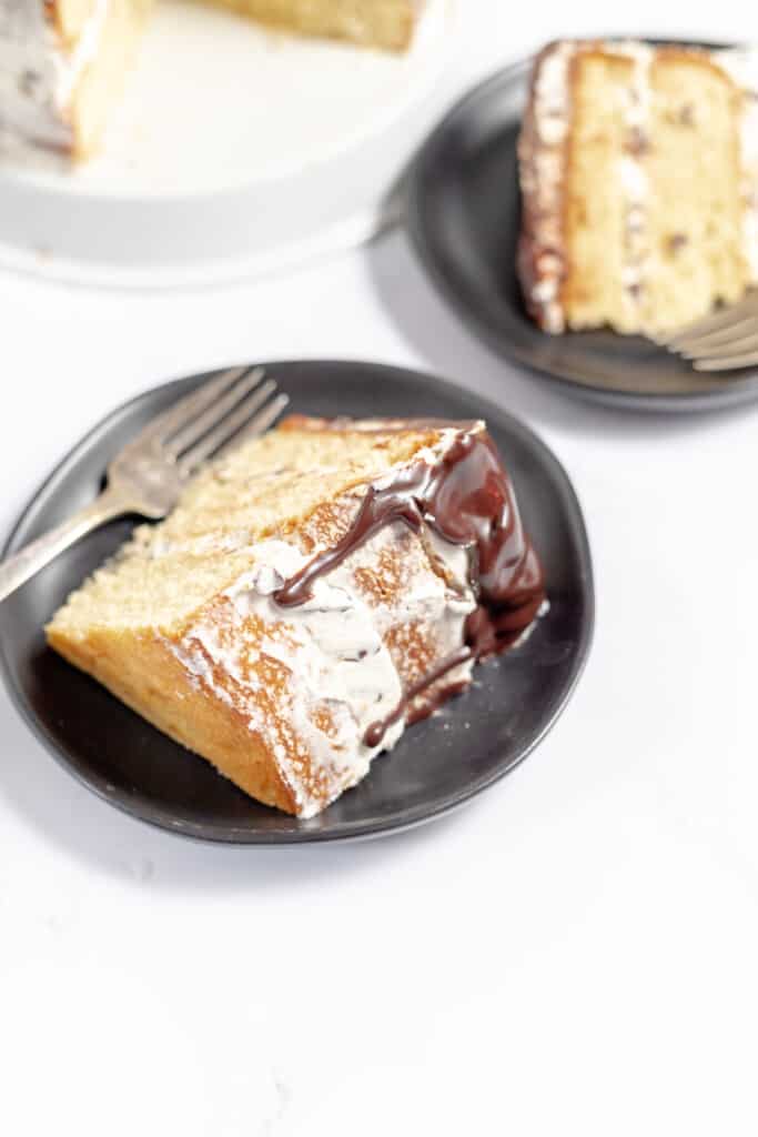 Cannoli Cakes echo the flavor of Cannoli but just in a cake form. A lot of recipes add a little splash of alcohol, or citrus zest, to grab some of those unique flavors. My easy cannoli cake recipe uses ricotta with a pinch of orange zest, whipping cream, mini chocolate chips, and chocolate ganache.