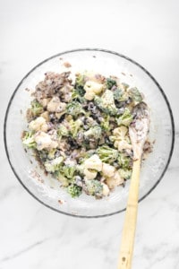 Put the broccoli and cauliflower in a mixing bowl add everything else except the sunflower seeds and stir to combine